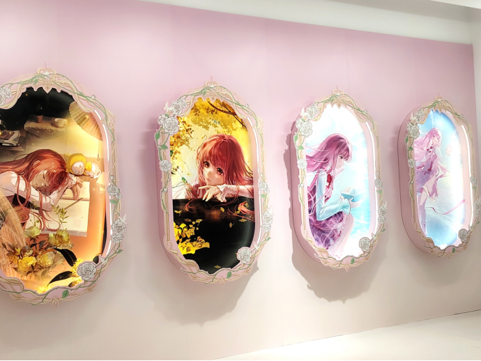 在墙面两侧,依次陈列着暖暖春、夏、秋、冬的形象,以及过往受到玩家喜爱的经典原画。工作人员将这一展区总结为“起点”,不仅是展览的起点,也是《闪耀暖暖》的出发点,在这之后所有温暖美好的故事,都是从遇见暖暖开始的。