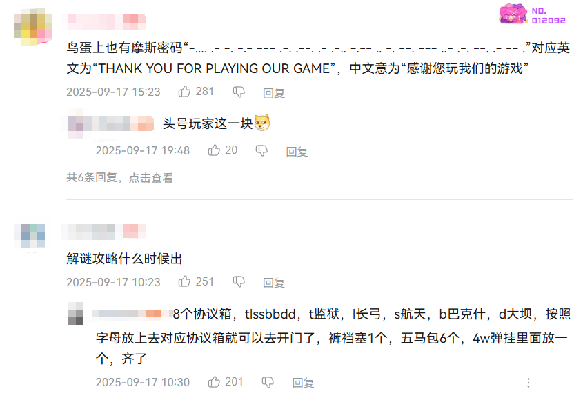 一时间,这个彩蛋点燃了玩家的热情,解谜相关的细节也很快被陆续挖掘出来。许多玩家在看过彩蛋后表示:也许这一年下来,《三角洲行动》还不够完美,但与朋友一起投入其中的时间,以及在游戏里遇到的每一位玩家,都是实实在在的经历,这或许正是情怀所在。