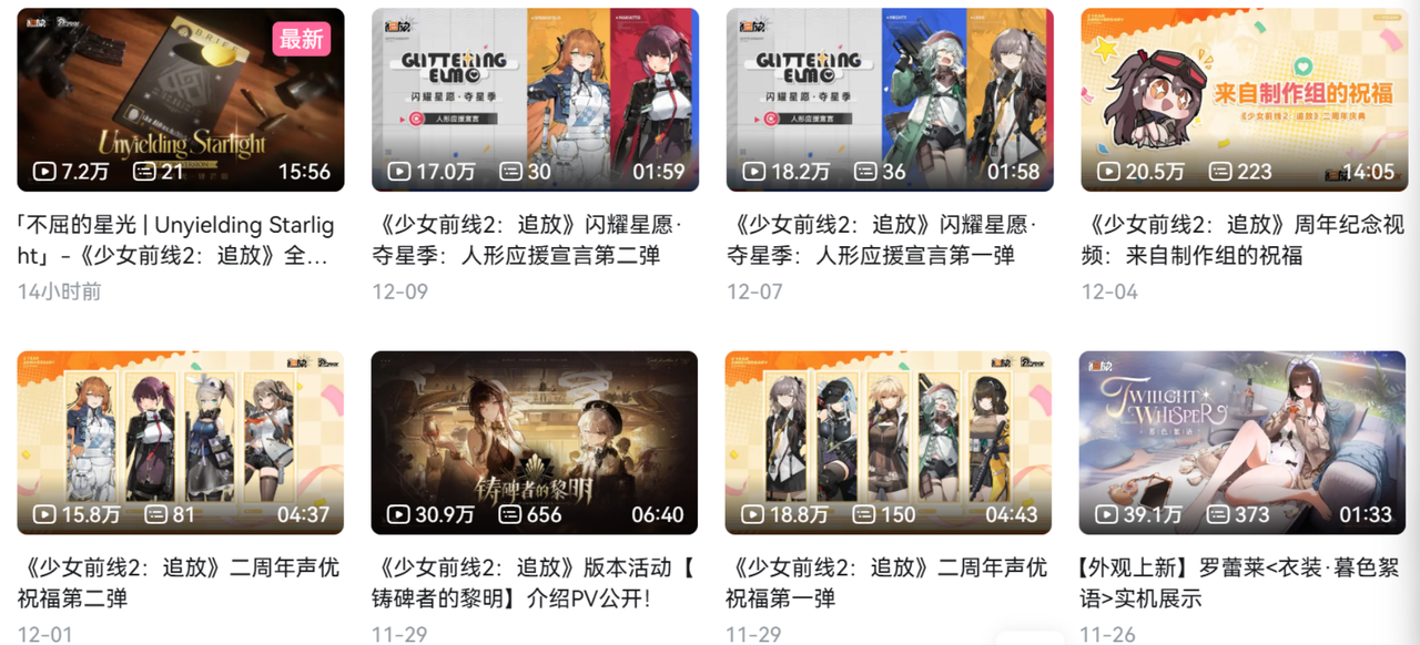 (游戏近期的周年宣传视频,每一个播放量都不低,还有很多新玩家在此垂直入坑)