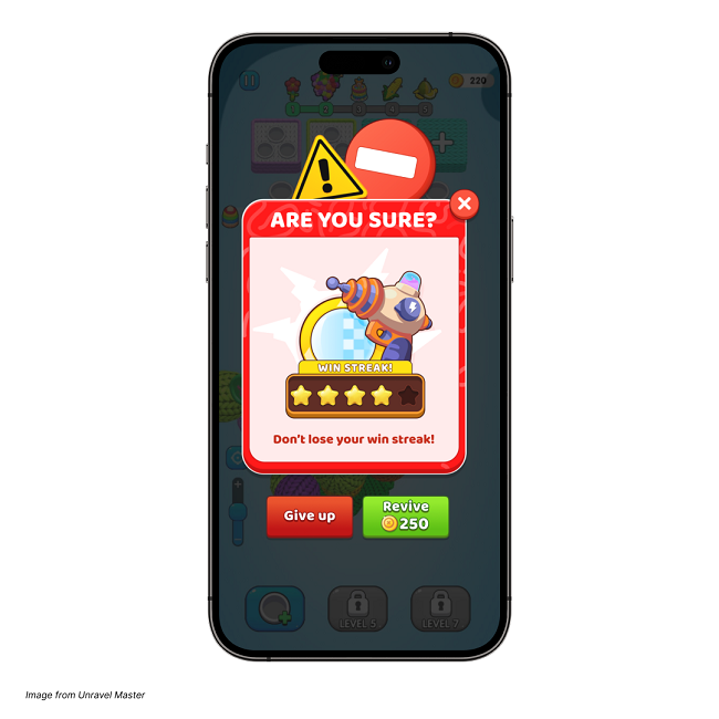 想要维持玩家粘性,变现机制必须与游戏节奏无缝融合。《Unravel Master》通过入口弹窗设置与关卡内嵌入 UI 提示进行引导,而非干扰玩家决策,使变现与游戏节奏自然共存,在保留沉浸感的同时,提升了玩家长期参与度。