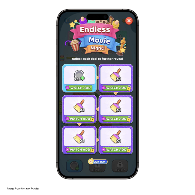 多数混合休闲游戏中,仅有少数玩家会通过 IAP 完成转化。因此,将 IAP 变现的体系同样应用于广告,是激活低转化用户的有效方式。例如,《Unravel Master》允许玩家通过观看广告解锁核心奖励,从而提升不同用户群体的 LTV(生命周期总价值)。