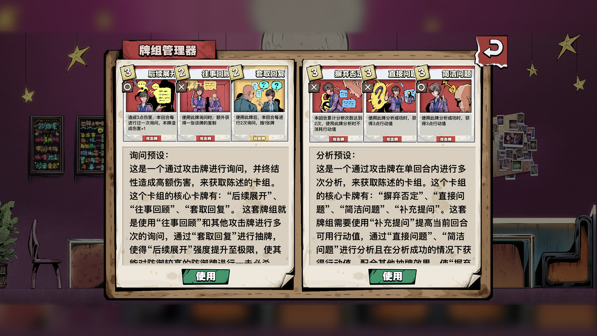 Q:玩家的目标不是击败敌人,而是击破证言、防御,拿到陈述。你们是如何把“警用询问”翻译成一套有趣的卡牌战斗规则的?