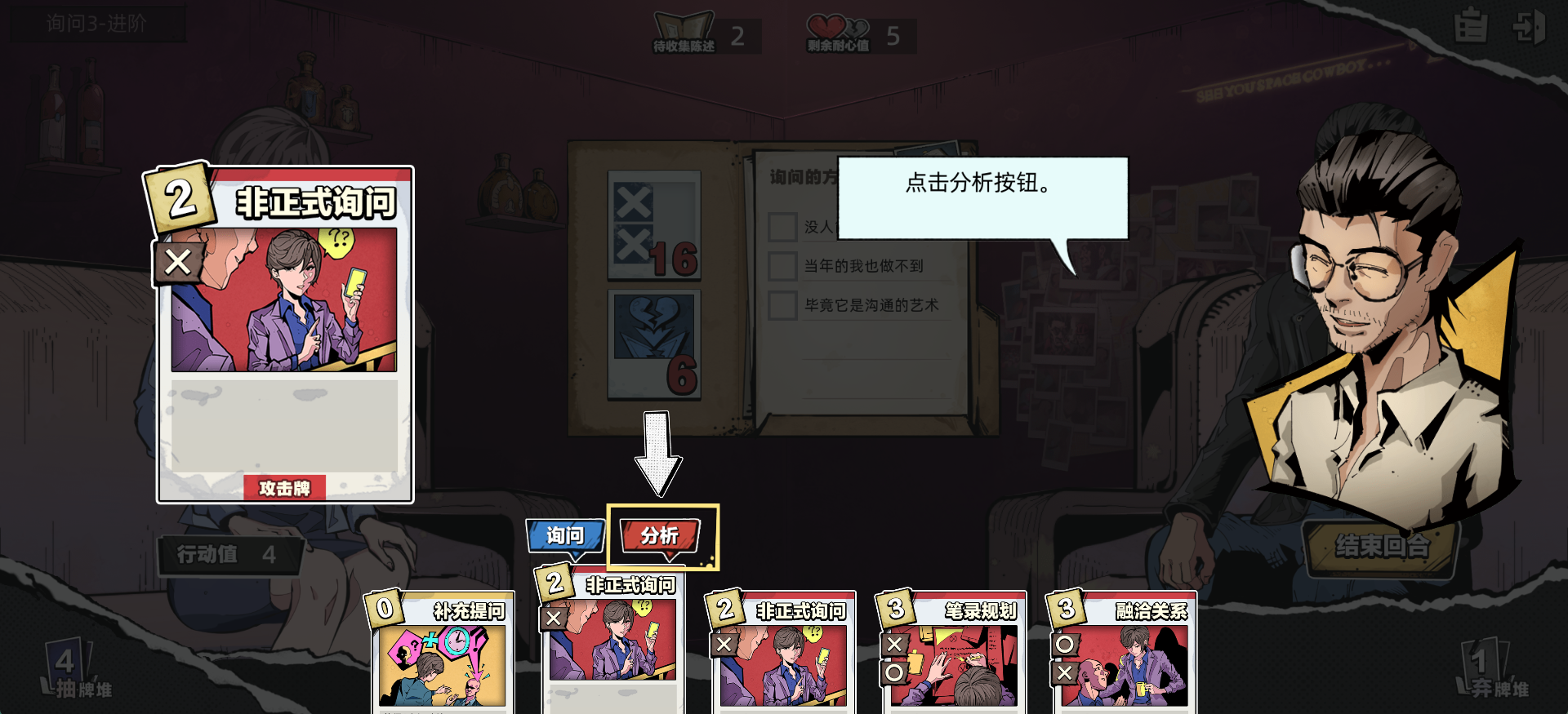 Q:游戏中有“询问”(击破防御)和“分析”(猜符号)两种获取陈述的方式。设计这两种路径是出于怎样的考虑?它们分别代表了推理中的哪种思维?
