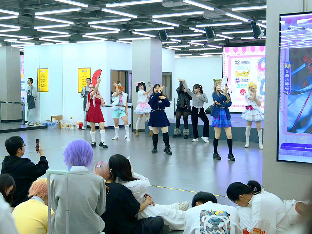 现场播放经典动漫及游戏曲目,现场小伙伴们伴随旋律起舞,动作整齐且富有感染力,带动全场观众参与其中。开放的舞蹈空间为参与者提供了表达热爱的平台,大家以肢体动作传递对二次元文化的喜爱,为整场活动注入动感活力。