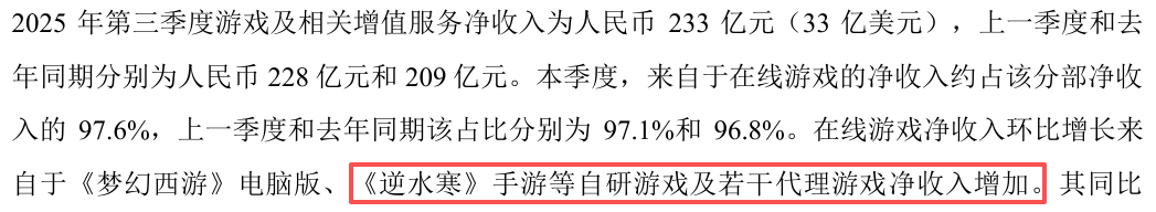 据了解,在网易前不久发布的2025年第三季度财报中,《逆水寒》手游连续第三年被置于显要位置并获得重点表扬,其强劲表现是推动网易游戏及相关增值服务净收入同比增长11.48%至233亿元的关键力量之一。