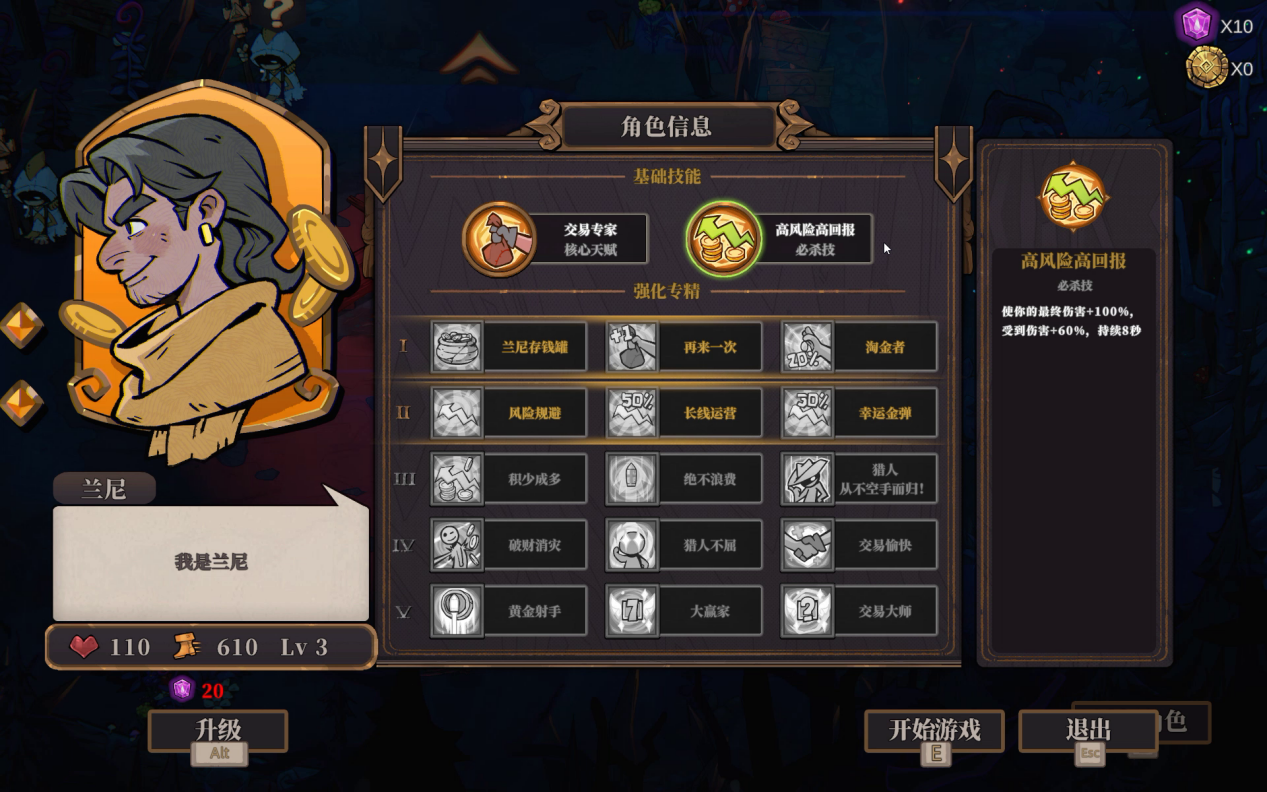 目前放出的Demo版本,在局外体系上只展示了四个基础模块:角色升级、难度选择、表情选择和剧情收集。