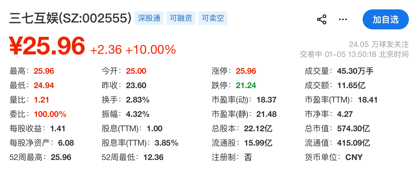 游戏的优秀表现同样获得了资本市场的注意。就在2026年开市的第一天(1月6日),三七互娱的股价出现强势涨停,并带动了整个游戏板块的活跃。