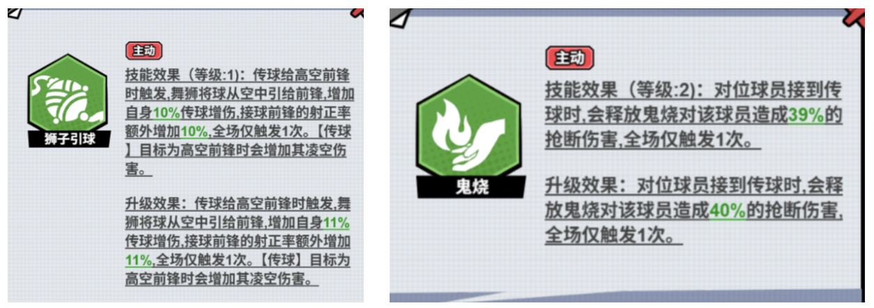 和现实中的足球运动类似,不同站位的球员有不同的能力属性。比如游戏中,前腰的“传球增伤”属性越高,传球就越难被对手拦截,也就越有机会推进到后面的射门环节;而后腰的“扑救减伤”属性则能直接影响对方球员的射门概率。