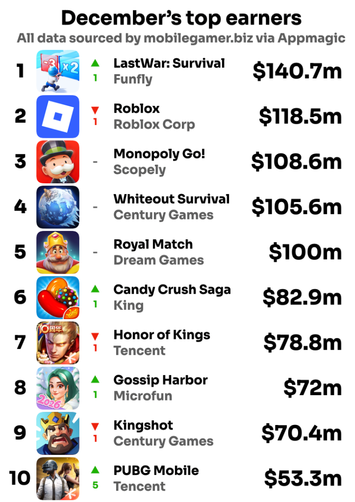 近日,外媒Mobilegamer.biz发布了2025年12月的全球手游收入榜。(注:数据来源AppMagic,统计范围不包括第三方安卓渠道、网页商店及广告收入,且已扣除平台分成)