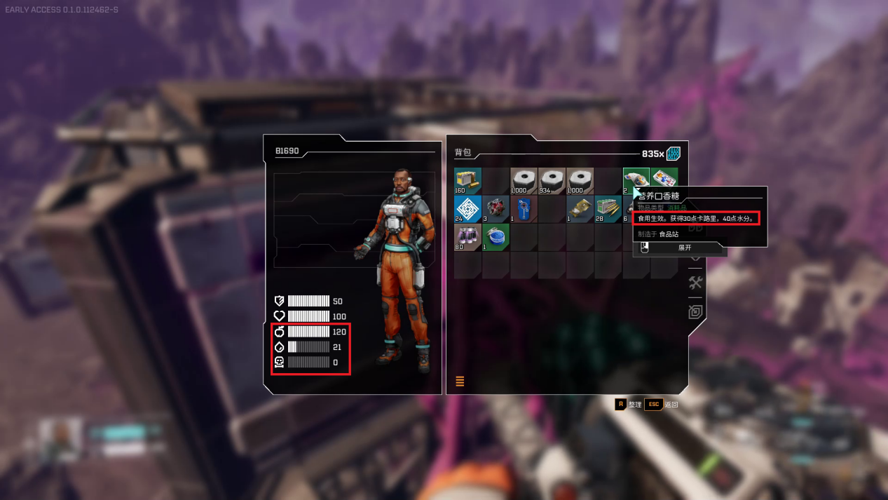 角色的状态则在UI界面通过具体数值展示,主要包括饱食度、口渴度和能量条,饱食度和口渴度过低会持续损失生命值,玩家需要通过探索来收集星球上的原生植物充饥解渴,或利用设施加工制作更高效的食物。