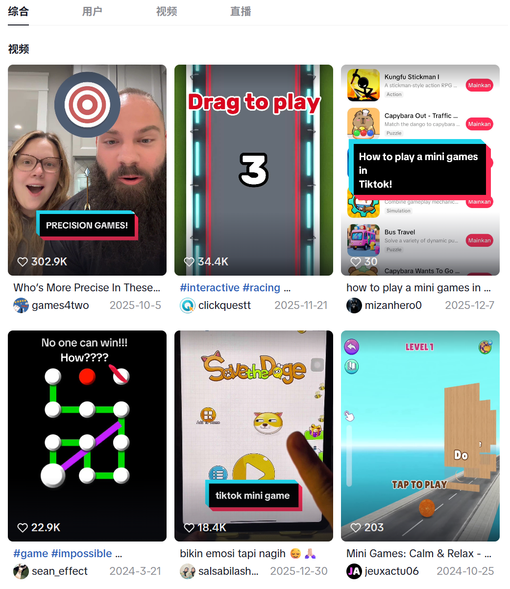而这种放量的一大表现,还体现在TikTok为小游戏提供的丰富入口上。用户既可通过主动搜索直达目标游戏,也能在Mini Games Center中因系统推荐而自然发现内容,显著拓宽了小游戏的冷启动通路。与此同时,个人主页的历史记录入口与可添加至桌面的快捷方式,则大幅降低了用户的回访成本,使轻量级游戏也能拥有接近原生应用般的便捷体验。此外,融合在达人视频中的锚点功能,更让小游戏得以直接嵌入内容流,在用户沉浸浏览时实现无缝触达。
