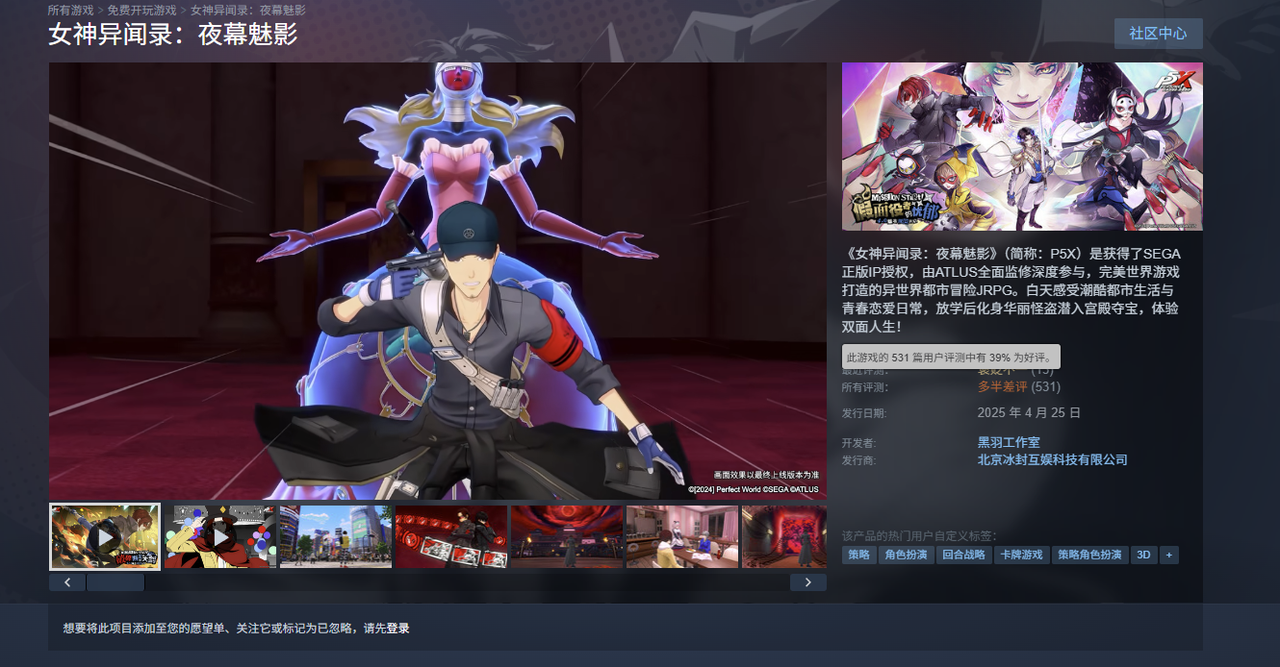 在PC游戏市场,《女神异闻录:夜幕魅影》表现同样亮眼。根据,Sensor Tower旗下Video Game Insights数据显示,该游戏上线首日Steam平台同时在线人数超过4.1万,截至7月底游戏总销量接近30万,与《解限机》《赛马娘》《蔚蓝档案》等,成为了6月下旬上市的销量最高的免费PC游戏之一。