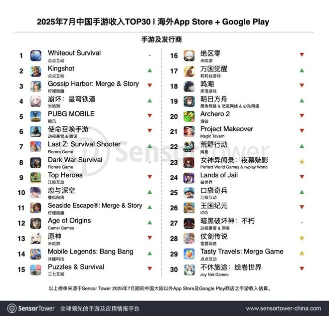7月更延续强劲势头,收入环比飙升128%,首次闯入Sensor Tower出海手游收入榜第23名,展现了该IP在全球市场的持久吸引力。