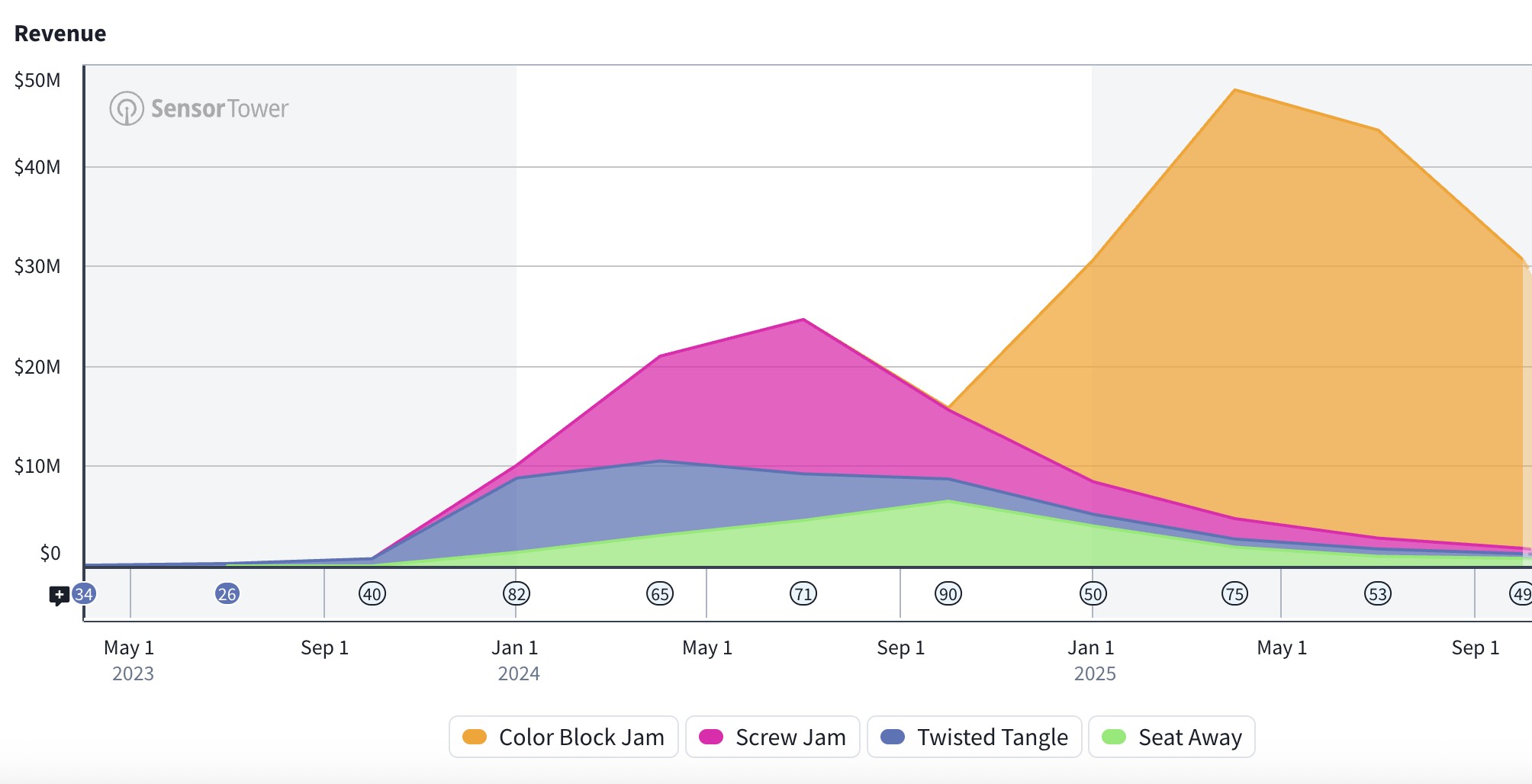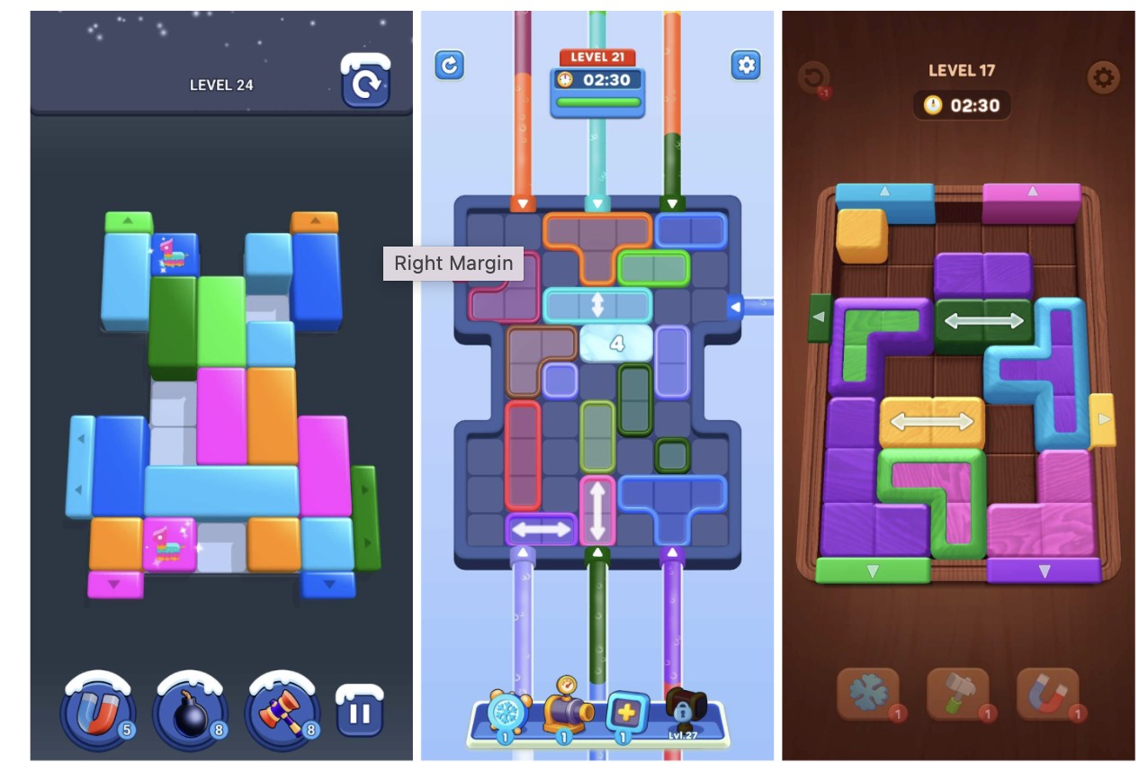 (几款依然表现强劲的《Color Block Jam》换皮作品:《Shape Escape》(左)、《Water Out》(中)以及《Wood Away》(右))