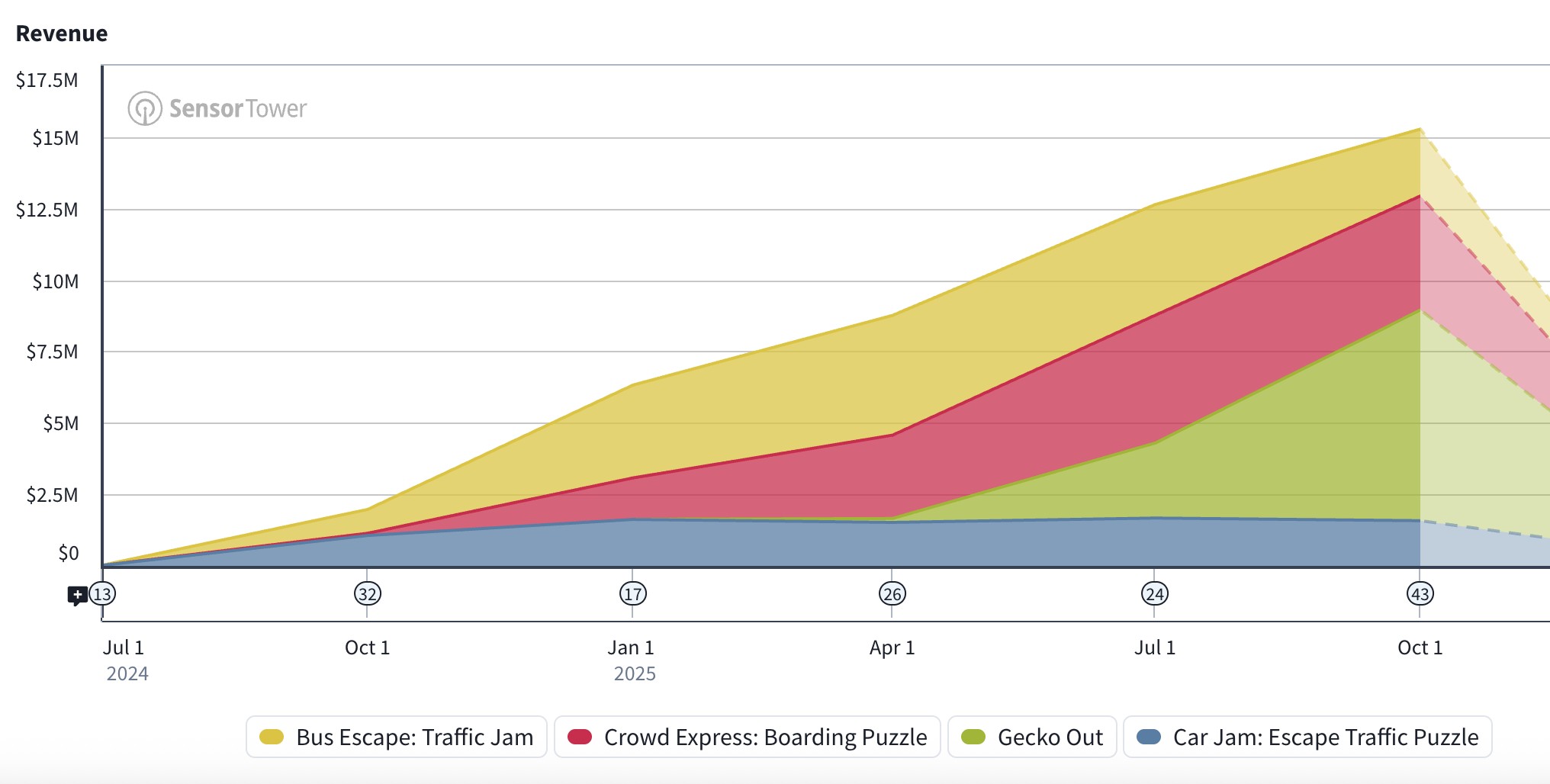 (《Car Jam》《Bus Escape》《Crowd Express》和《Gecko Out》这四款头部第三代方块解谜游戏,在过去一年中下载量有所下滑)