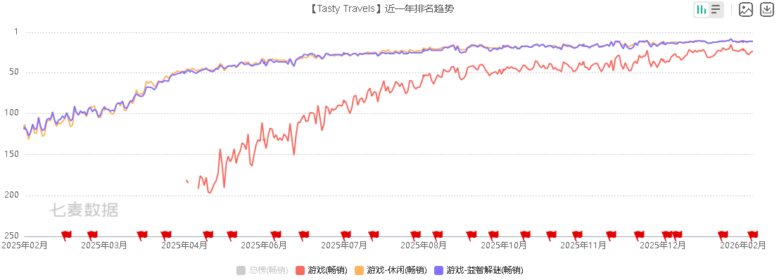 作为点点互动在休闲游戏赛道上的开路先锋,《Tasty Travels: Merge Game》在过去一年的增长势头十分喜人。此次营收爆发,就是其产品潜力的体现。