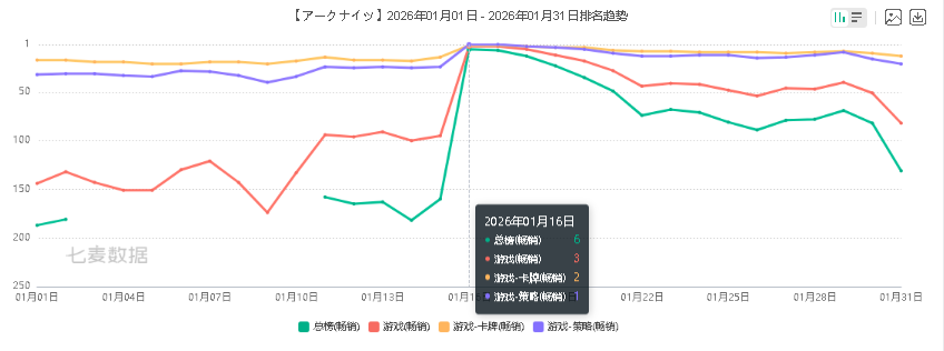 首先,是二游的营收爆发。无论是以海外为主战场的《蔚蓝档案》、《明日方舟》日服,还是以国内市场为核心的《明日方舟:终末地》,都在一月份取得了很不错的成绩。这无疑为刚经历了2025年寒冬之后的二游市场点燃了一枚希望的火种。
