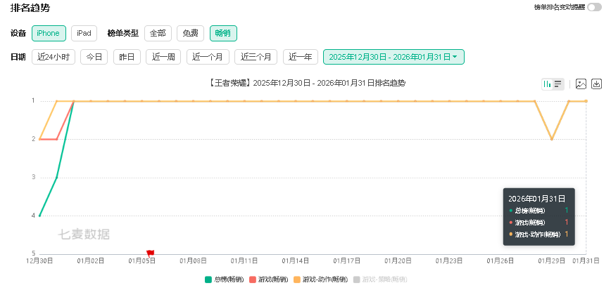 在重磅活动与玩法的加持下,《和平精英》1月的营收表现一样十分惊人。虽然没能超越《王者荣耀》登顶畅销榜,但也基本稳定在畅销榜前五名。