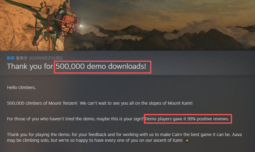 然而,上个月(1月30日)由法国独立工作室The Game Bakers正式发售的《孤山独影》(Cairn),则以拟真与硬核的设计,在单人沉浸式体验方面取得了现象级的成功,其市场热度与玩家口碑在发售初期便达到了惊人高度。