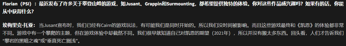至于《孤山独影》,其开发计划最早可追溯至2021年,立项时间点也早于后来市场上出现的《Jusant》、《Peak》等同题材产品。对于这种“扎堆”的现象,Thoa表明只是巧合而非竞争,强调团队在长达五年的开发周期中始终专注于自身的创作理念,并未受外界趋势影响。