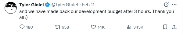不过从市场成绩来看,《喵喵的结合》不仅没有因为漫长的开发周期而变得无人问津,反而迅速成为了今年以来最“爆”的一款独游作品:发售后仅仅几个小时,游戏就成功超越《CS2》和《APEX》等作品登顶了Steam平台的全球畅销榜,开发者之一的格莱尔更是直接在社交平台开起了香槟,宣布项目“已经收回全部开发成本”,并对支持他们的玩家表达了感谢。