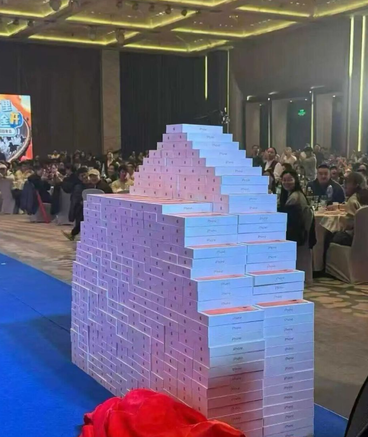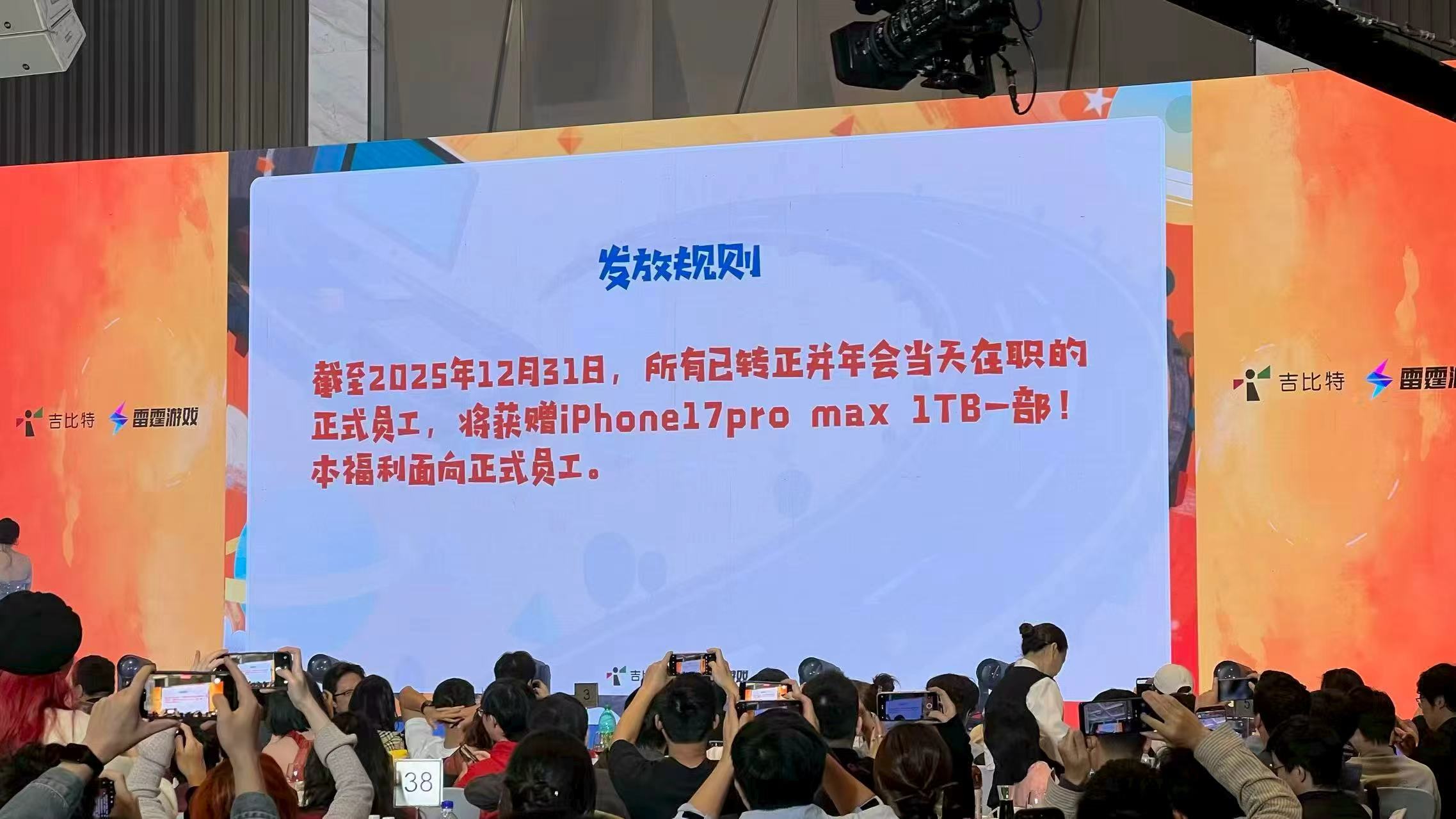 此外,吉比特还给所有已转正且当天在职的正式员工,每人配了一台iPhone 17 Pro Max 1TB,现场照片显示手机在台上堆成了小山。