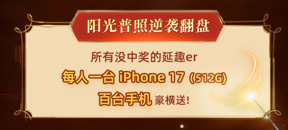 另一边,波克城市在年会上豪气地准备了876台iPhone17 Pro Max作为抽奖奖品,就算没有手机,也有飞天茅台可得,不会漏掉一个人;同样送手机的还有边锋(广州),200人的年会,他们就发了140台的iPhone17 PM,中奖率高达70%;而前文提到的延趣,更是在年会现场即兴把阳光普照统统升级为iPhone 17。