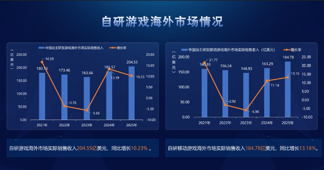 根据中国音数协游戏工委发布的《2025年中国游戏出海研究报告》,2025年中国自主研发游戏在海外市场的实际销售收入约为205亿美元(人民币1416亿),其中手游就贡献了约超185亿美元(人民币1278亿)的收入。