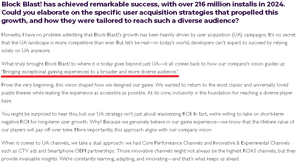 而Hungry Studio在2025年4月接受外媒采访时,曾将《Block Blast!》成功的深层次原因,归结为公司“为更广泛、更多元化的受众带来卓越的游戏体验”的愿景。