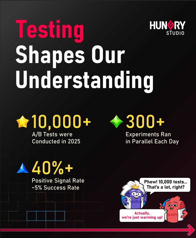最引人瞩目的,无疑就是他们的创新策略。Hungry Studio在领英发布的年度成绩单显示,仅在2025年,他们就对《Block Blast!》进行了超过10000次A/B测试、日均测试达300次以上;而他们内部的“无领导创新”组织特色,则为这些测试提供了海量的创意来源,使得Hungry Studio始终拥有向前探索的驱动力。
