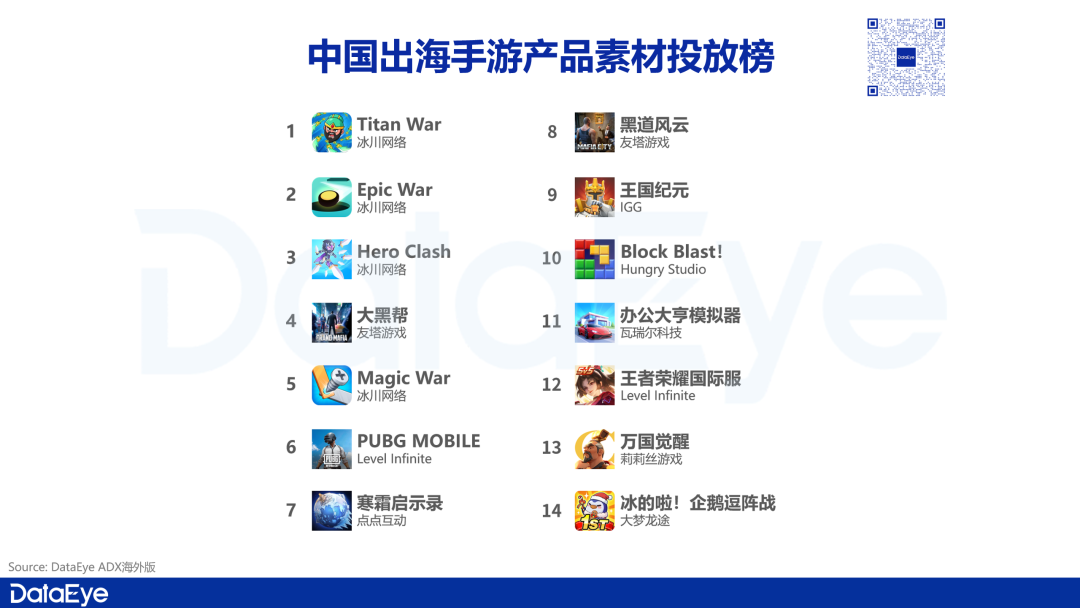 与其他产品相较,《Block Blast!》更是毫不逊色。据DataEye数据显示,其投放量在海外手游和中国出海手游中均名列前茅,甚至超越了部分头部厂商。