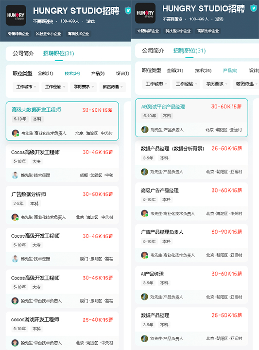 从Hungry Studio在BOSS直聘上招聘的职位来看,目前他们的人才需求集中于动效(cocos引擎方向)、大数据分析和产品测试发行。笔者由此猜测,他们未来的发展重心仍然会集中在以IAA变现为主的休闲游戏出海赛道。