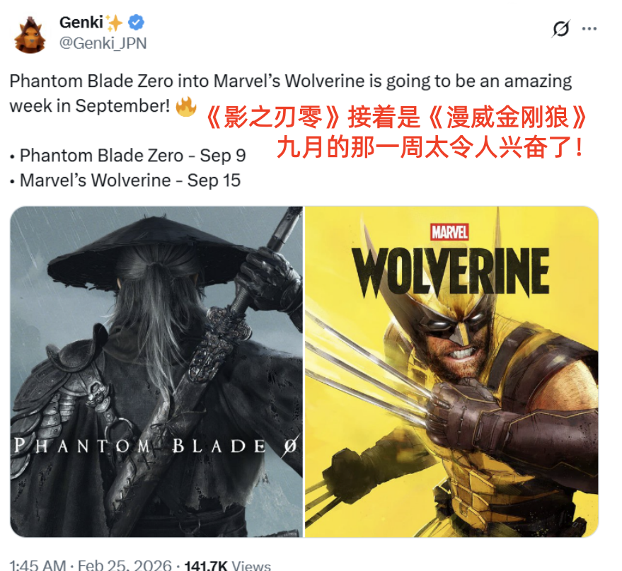 如此深受全球玩家关注的两款重磅动作游戏,其发售日期仅相差一周,这个消息引发了海外玩家们的热议。玩家们在彼此较为友好的氛围中进行讨论,主流观点认为两款游戏都是不容错过的优秀作品,《漫威金刚狼》的超级英雄爽感与《影之刃零》的武侠美学各具魅力,不存在取舍之分。