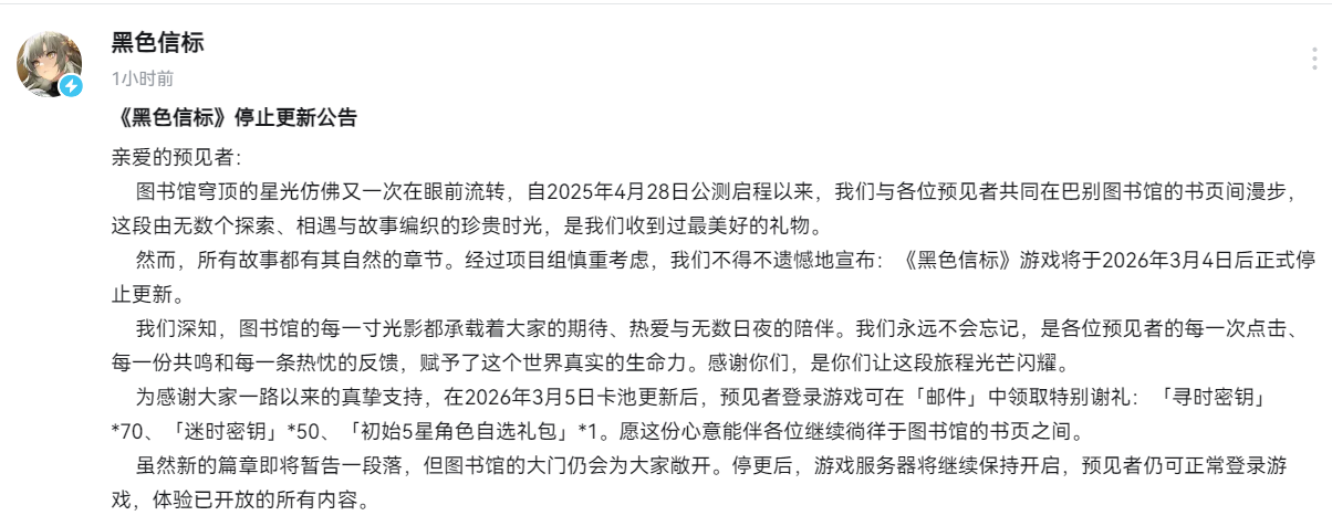 今天(3月4日)下午,由广州明昼科技开发的ARPG二游《黑色信标》对外发布了一则停更公告,表示游戏将正式停止内容更新。与此同时,《黑色信标》服务器将继续保持开启,未来会上线每期约持续30天的「复刻检索」活动,并通过邮件向玩家同步发放“感恩陪伴谢礼”。