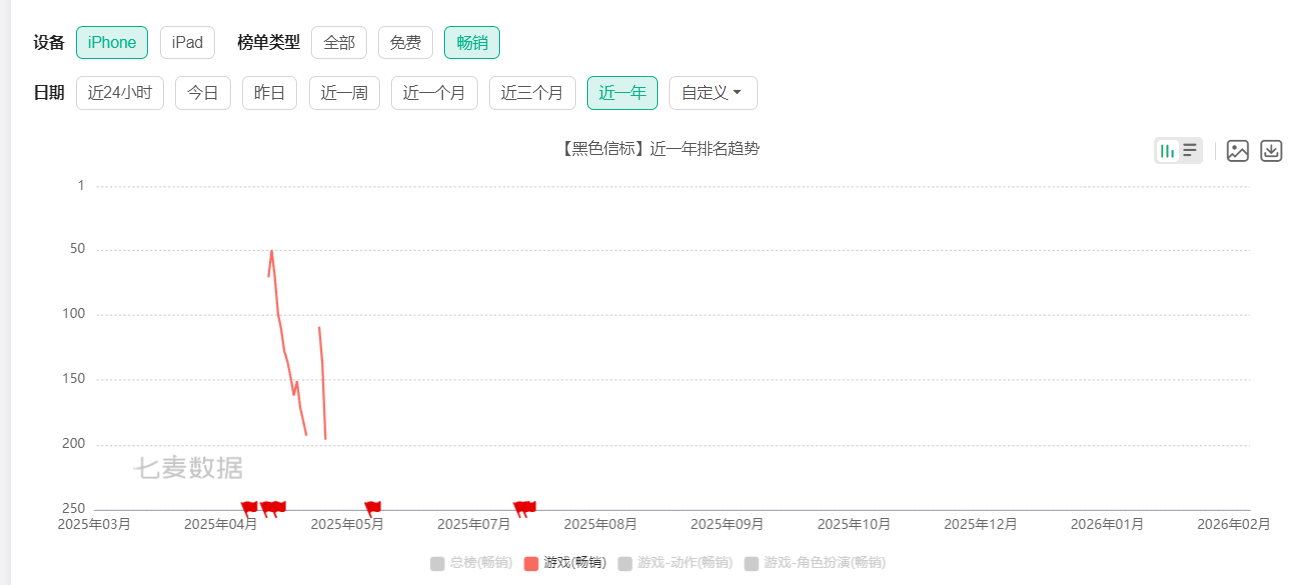 去年4月份上线之后,虽然游戏一度在国内iOS免费榜登顶,但由于开服炸服等意外事件带来的负面影响,《黑色信标》并没有打出预期的良好开局,最高仅仅取得iOS畅销榜50名,随后便开始迅速滑落,开服一个月左右便几乎从榜单上完全消失,直到停止更新也再未有所起色。