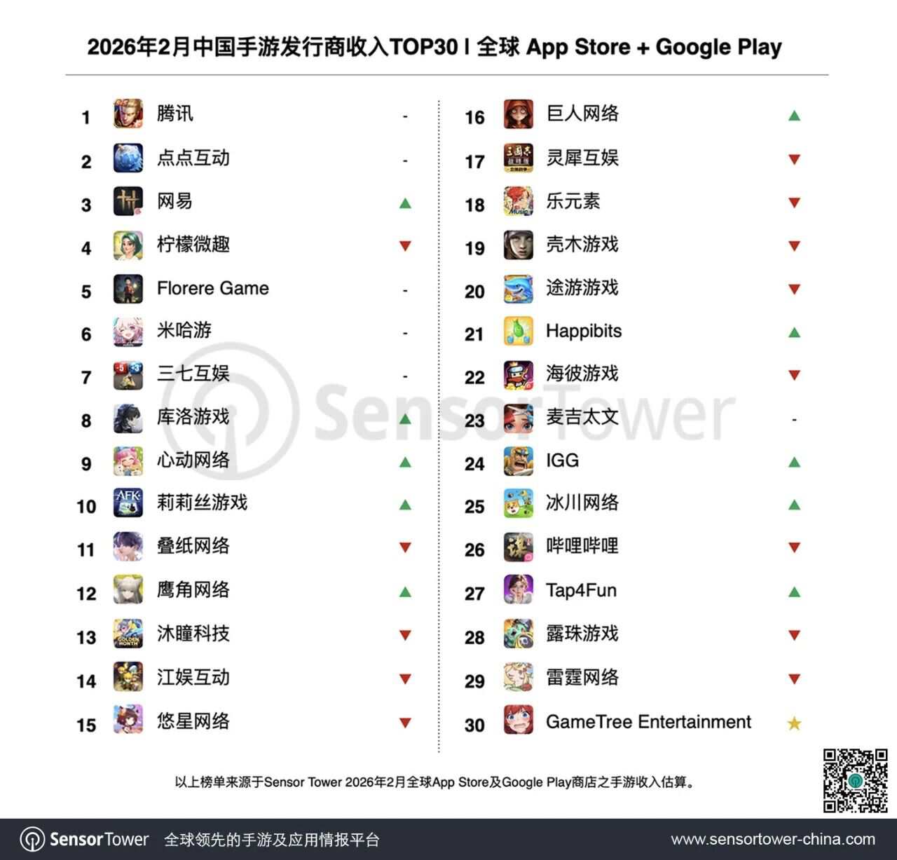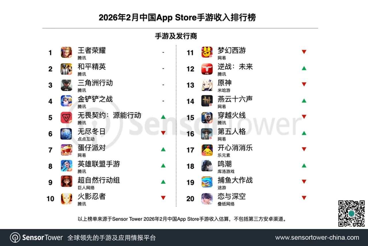 最近,Sensor Tower发布了2026年2月中国手游发行商全球收入排行的TOP30。(下文简称TOP30,仅统计发行商收入,且不包括中国地区第三方安卓渠道)