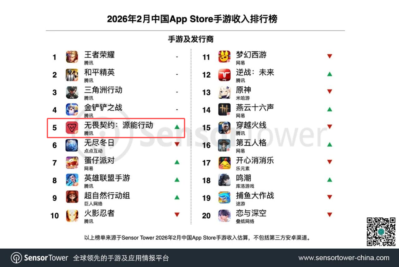 本期榜单中,腾讯《王者荣耀》《和平精英》《三角洲行动》《金铲铲之战》稳居TOP4;《无畏契约:源能行动》收入上涨42%创历史新高,首次跻身TOP5;《逆战:未来》收入大涨55%,位列TOP12。