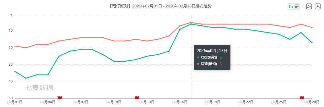 其中,《蛋仔派对》在2月16日(除夕)成功杀入畅销榜TOP10,并在次日冲进畅销榜TOP5,整个春节假期基本都保持在TOP10。