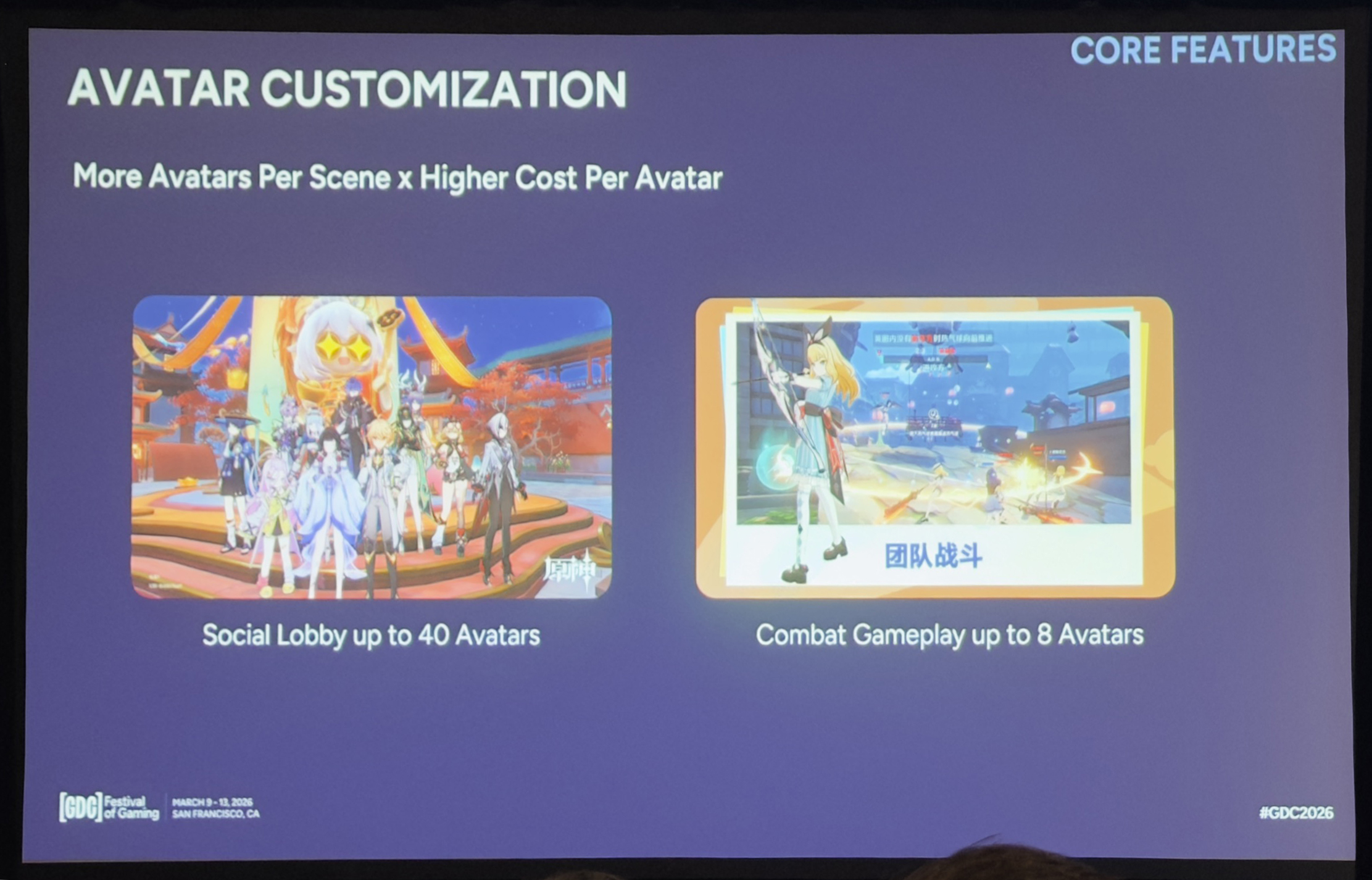 更棘手的是,「千星奇域」的目标是同屏人数达到战斗中最多8人,社交场景中最多40人。和原生的四人联机相比,渲染和动画所需的成本会成倍增长。哪怕每个化身的开销和原生角色一样,并发数量的增加也会让渲染、动画和功耗飙升。这迫使我们从底层重新思考每个化身的效率,并引入系统级的可见性管理和LOD控制。