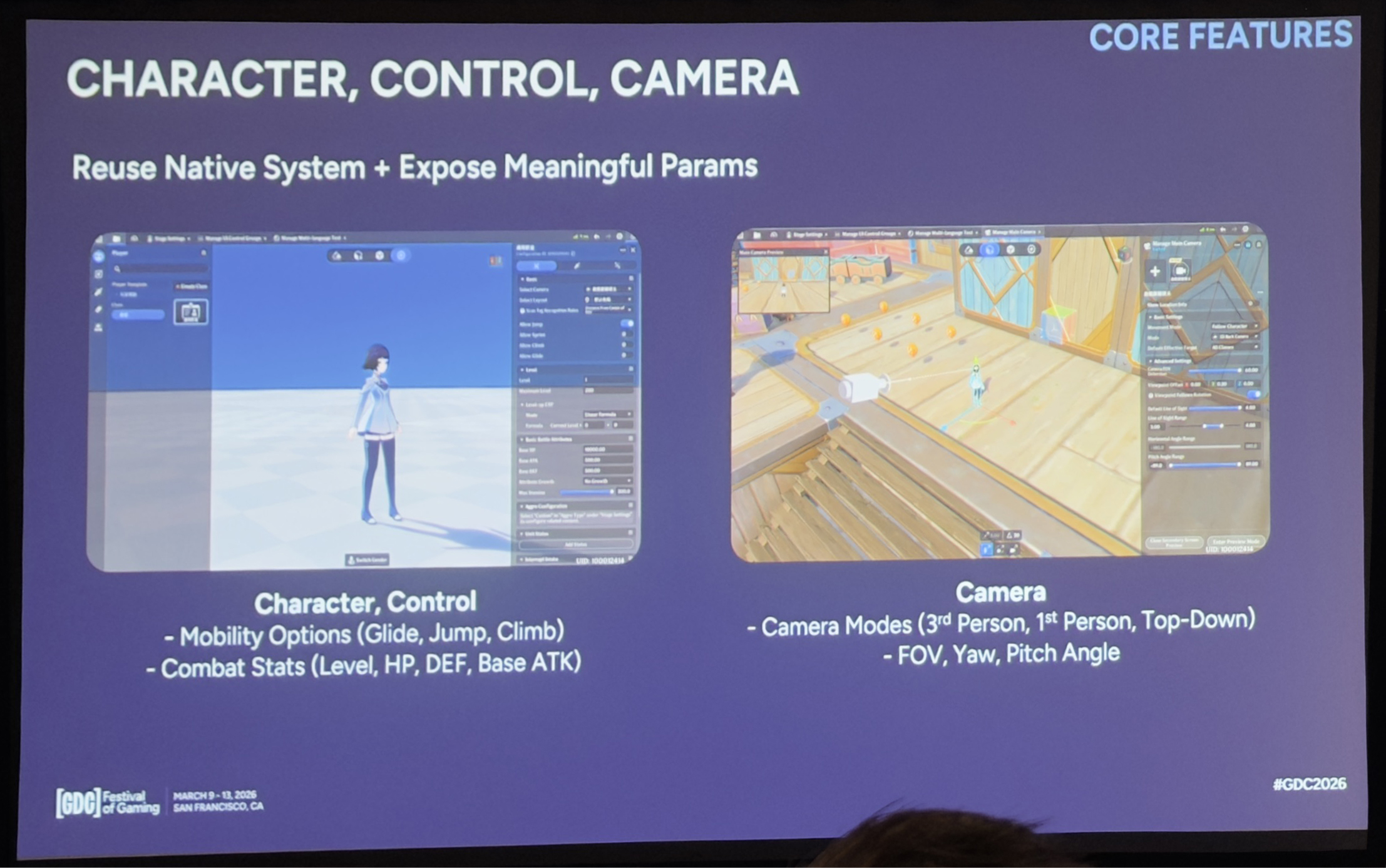 先从3C说起。因为这个系统既强大又极其敏感,连专业开发调优都需要经验和反复试错,因此我们刻意不暴露底层机制,而是复用原生系统,只开放那些不易误用的高级参数。比如移动能力的开关、限定范围的战斗数值,以及相机配置等等。这样既保留了“原神感”,防止创作者对基础移动机制造成破坏,又能保证平台性能可预测,同时支持多种玩法风格。