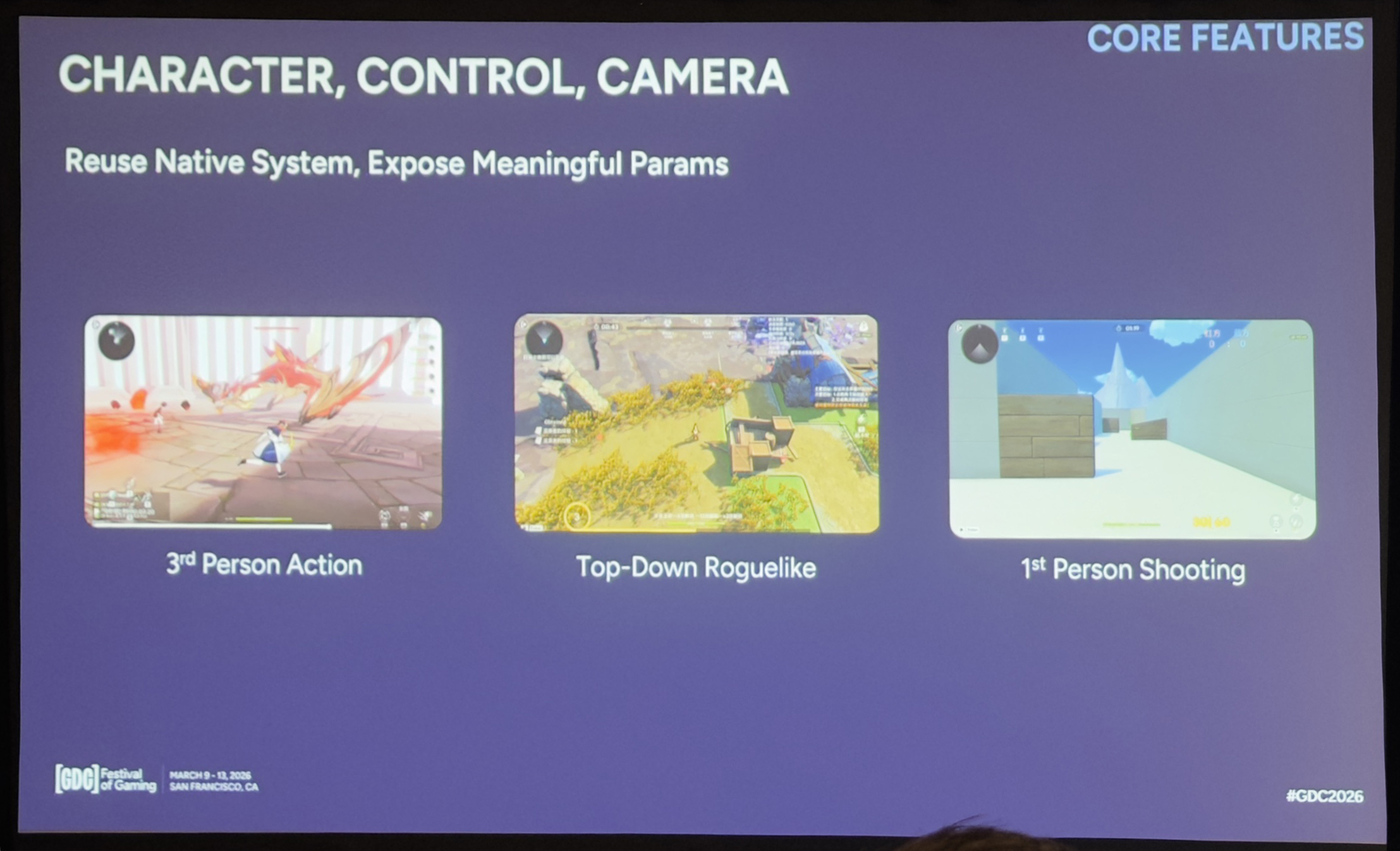 一旦在合适的抽象层次开放3C,实现不同类型的游戏就变得异常简单。第三人称动作可以直接沿用默认预设,做俯视角Roguelike只需切换相机模式、加上移动限制、调整数值节奏即可;第一人称射击则可以通过第一人称相机加上投射物交互来实现。