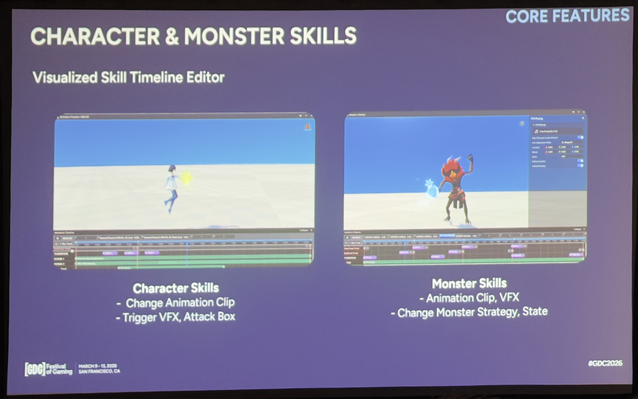 与3C不同,「技能」更具标志性,也定义了实时的玩法变化。因此这里需要真正的编排能力,而不仅仅是对参数进行调整。对此,我们把技能设计成了动画片段、特效触发器、伤害判定框(Hitbox)、攻击窗口、逻辑事件等模块化的构建块创作者可以在可视化的时间轴编辑器里编排这些元素,预览和快速迭代,无需启动整个游戏。