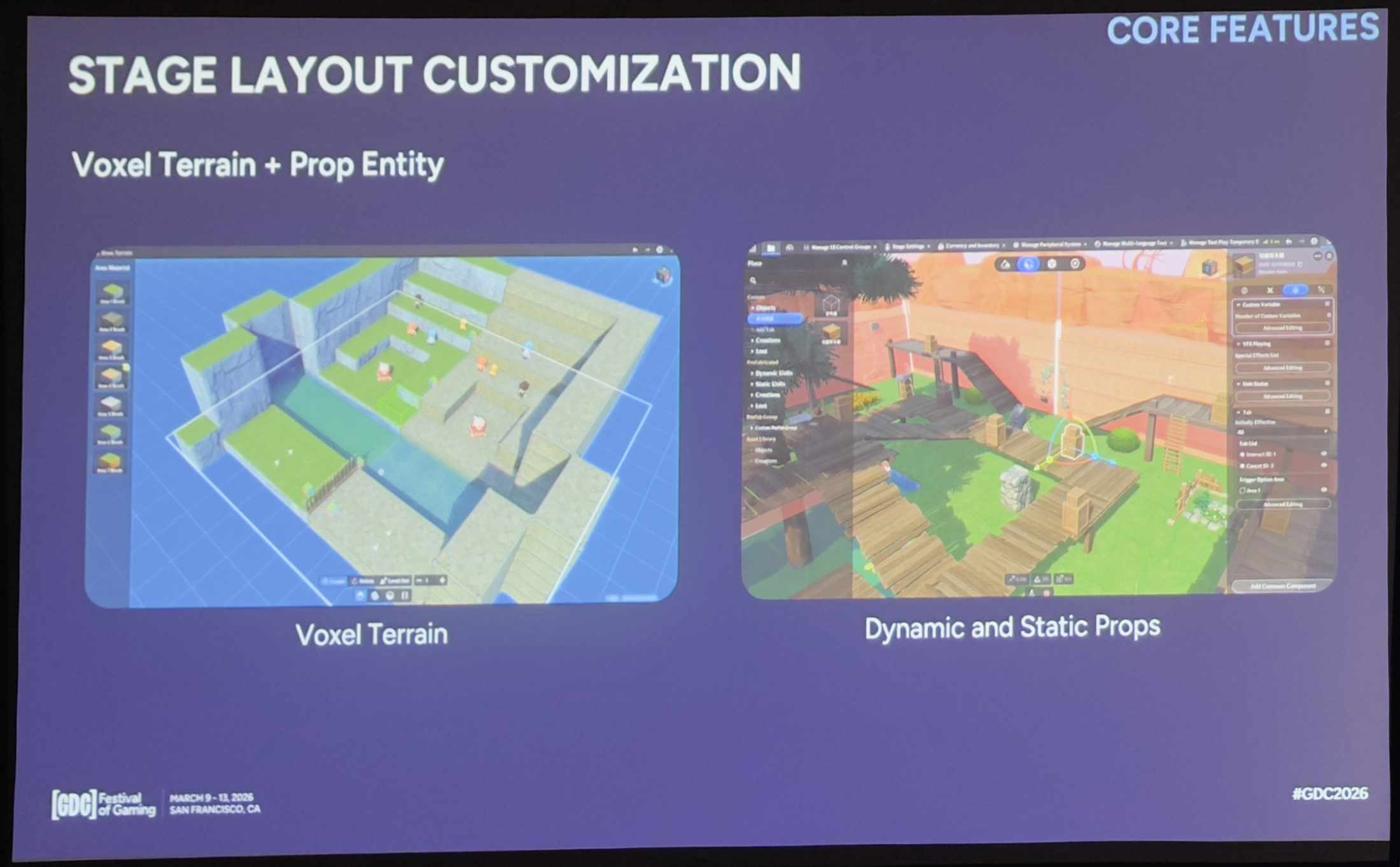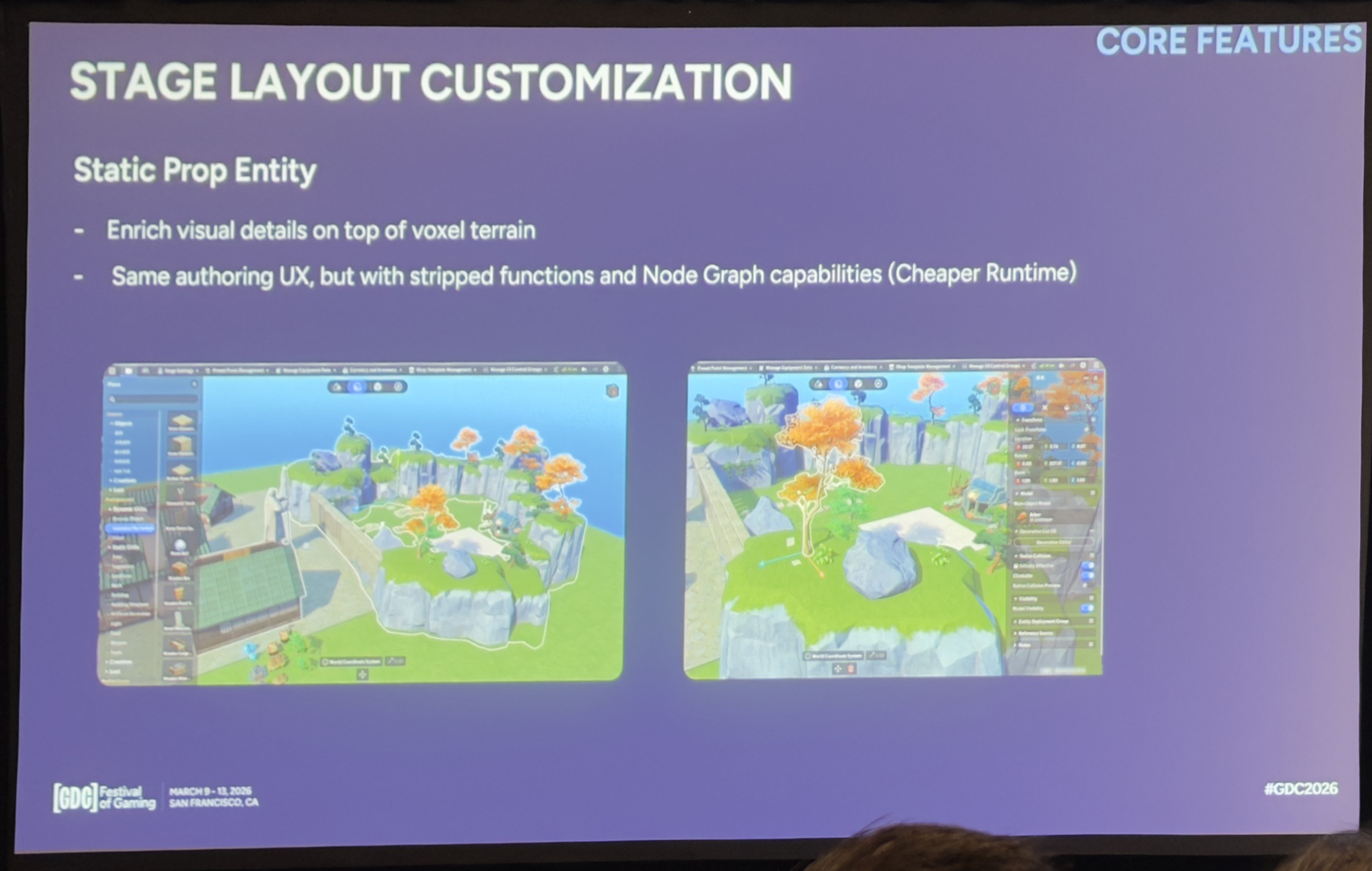 相比之下,静态实体用来丰富体素地形上的环境——做场景装饰、地标和细节。在编辑器里我们也尽量保持了和逻辑实体相似的操作,这样创作者就不用换来换去了。但在运行时,静态实体是不支持插件或节点图的,因此组件更轻量,更新开销更低。这种分离让创作者能搭出视觉丰富的场景,且不用承担不必要的消耗。