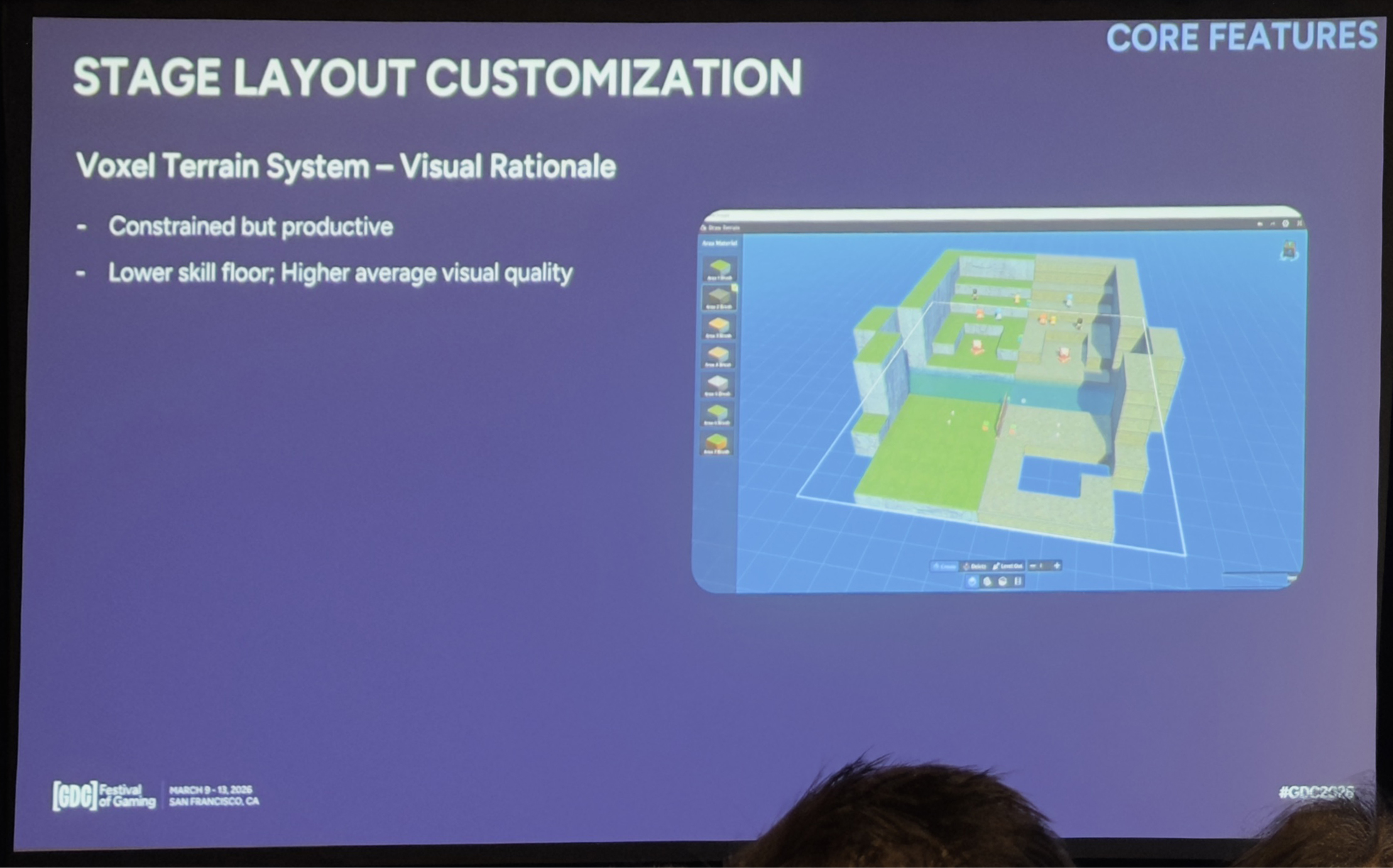 之所以选择体素而不是传统的高度图地形,主要是为了降低创作者的使用门槛。高度图固然好用,但学习成本太高,很容易出现边界报错、纹理混合或者根本走不上去的斜坡等问题。体素虽然有更多约束,但这种约束从另一角角度来看其实是优势——创作者能很快做出清晰、一致的地形,学习成本低,整体质量高。对一个UGC生态来说,“快速出个不错的效果”和“极致的表达力”其实同样重要。