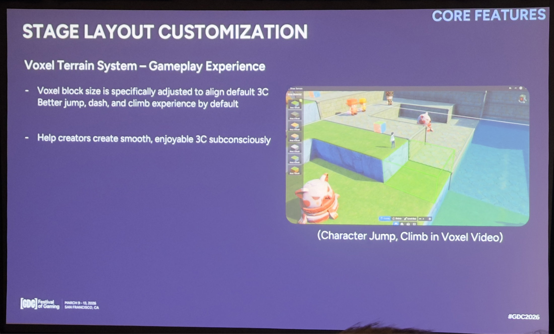 体素地形也提升了游戏手感。我们调整了体素块的大小和踏步行为,使其与默认的跳跃弧线、攀爬判定、冲刺穿行以及通用的碰撞预期等移动模型保持一致。这意味着即便创作者不懂移动设计,也会下意识地搭出和默认3C“天生契合”的关卡。换句话说,地形系统会引导创作者做出合理的几何结构,且不需要去记那些隐性的移动规则。