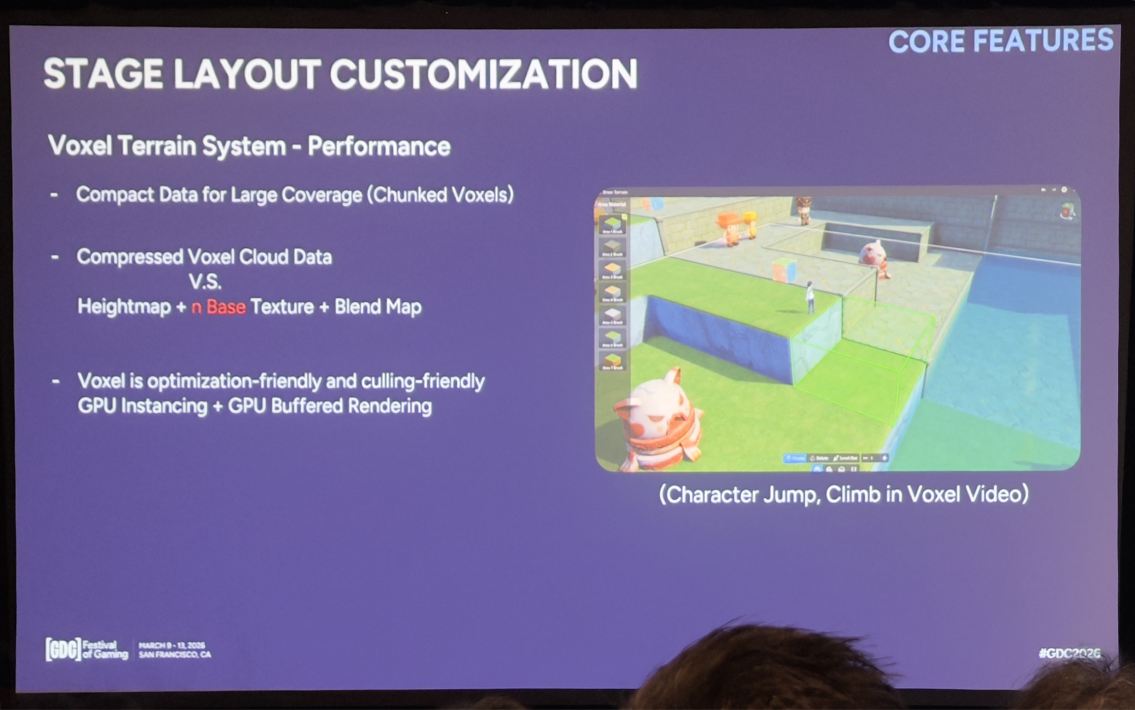 性能优化是另一个重要考量。传统地形常把高度图和多个纹理层、混合贴图结合在一起,既占用大量存储,也对渲染带宽很不友好。我们的体素地形采用分块设计,即使在大规模下也非常紧凑,天生适合实例化。我们还采用了基于GPU缓冲的渲染方案,最大程度减少每帧CPU和GPU的通信——这对移动端尤其重要。这种组合既能支撑大规模UGC,又能保证性能优化可预测。