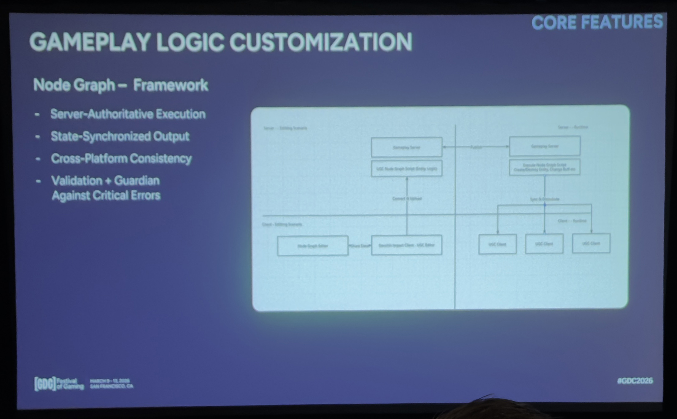 而节点图运行在一个服务器状态同步的框架中,这和《原神》中处理多人一致性的方式相同,不仅保证了跨平台的体验一致性和玩法公平性,也防止客户端差异演变成“内容性错误”。同样重要的是,这个框架为我们提供了天然的验证和保护层——即使创作者犯了逻辑错误(比如无限循环),我们也能发现并断开,防止整个应用崩溃。