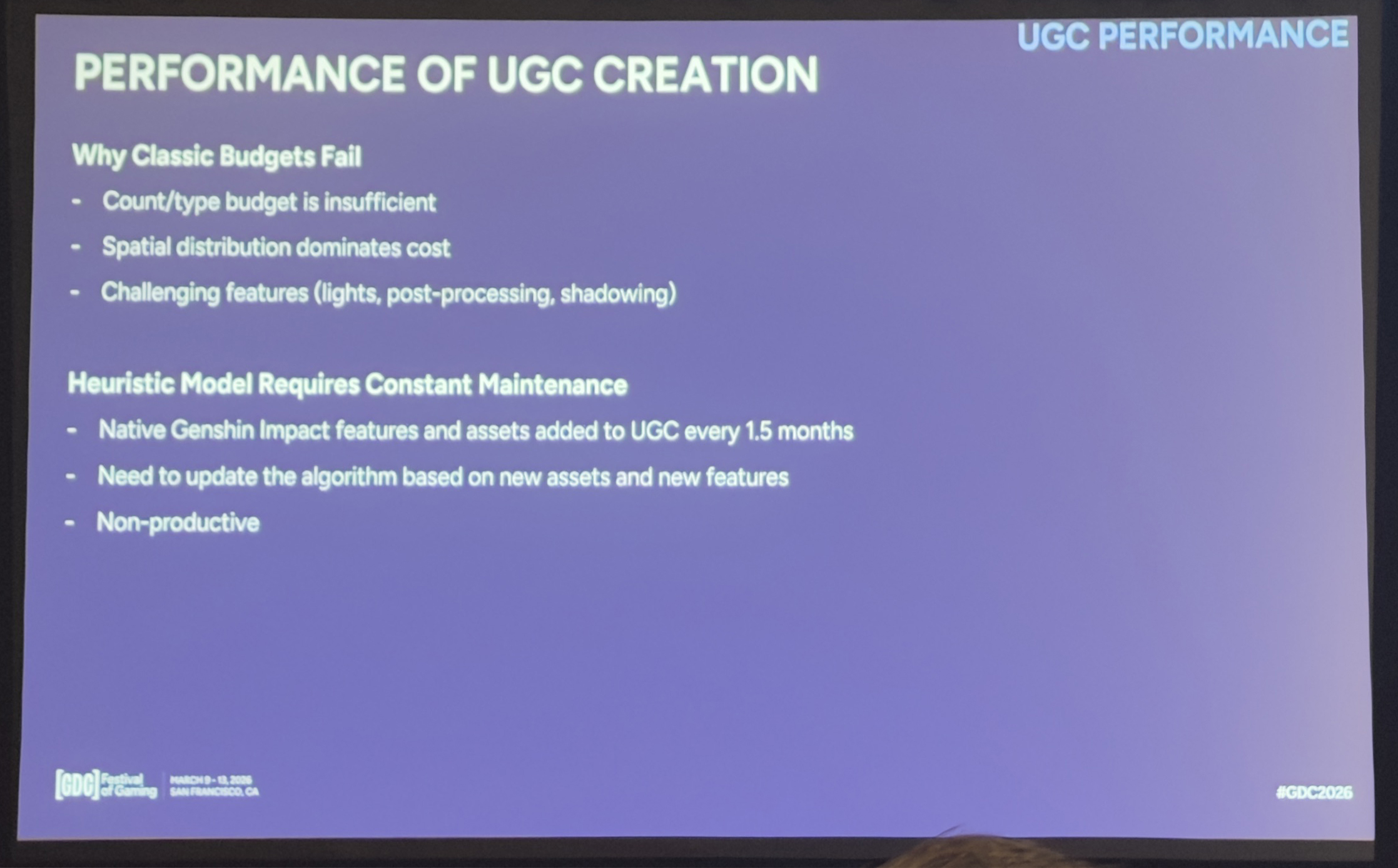 大多数创作者都知道性能优化很重要,但往往不知道哪些具体操作会导致性能优化出问题。所以UGC的性能优化很容易“爆炸”:实体数量多、结构以及可见性等方面都极容易出问题。关键是这些问题往往基于空间和系统的综合因素:分布、可见性、光照交互……而不仅仅是“实体太多”。因此,仅仅限制实体数量是不够的。