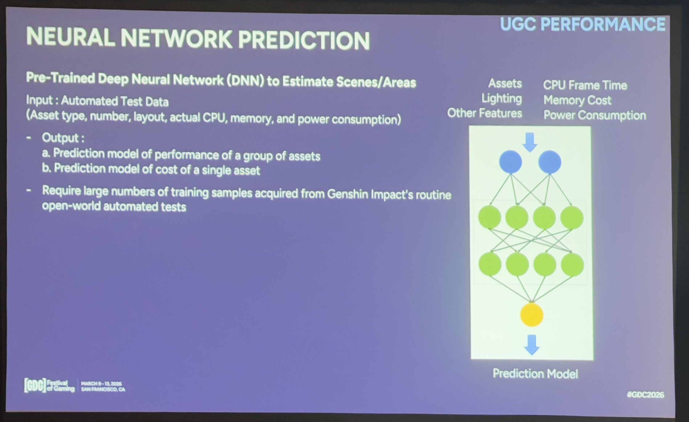 而《原神》恰巧已经有大规模的自动化性能优化测试数据,这也引导了我们摸索出数据驱动的方法:一个神经网络模型。它的输入包括资源构成、空间布局、功能特性,以及实测的CPU帧时间、内存开销和功耗。我们内部评估下来,预测误差通常在10%左右。最大的优势是运维层面:当加入新内容或新功能时,我们可以收集新样本重新训练模型,而不用手动维护跨平台的启发式规则。