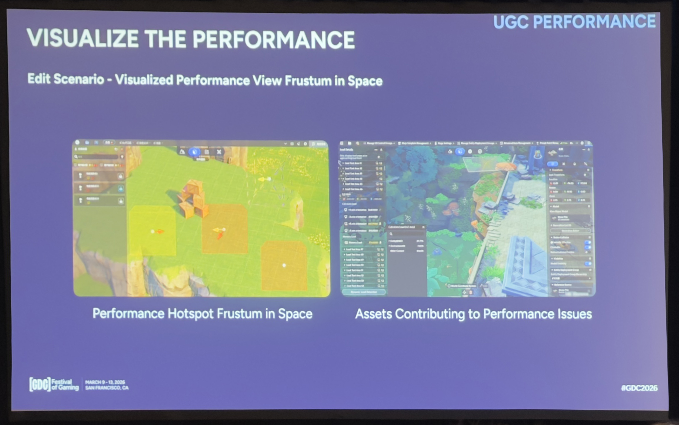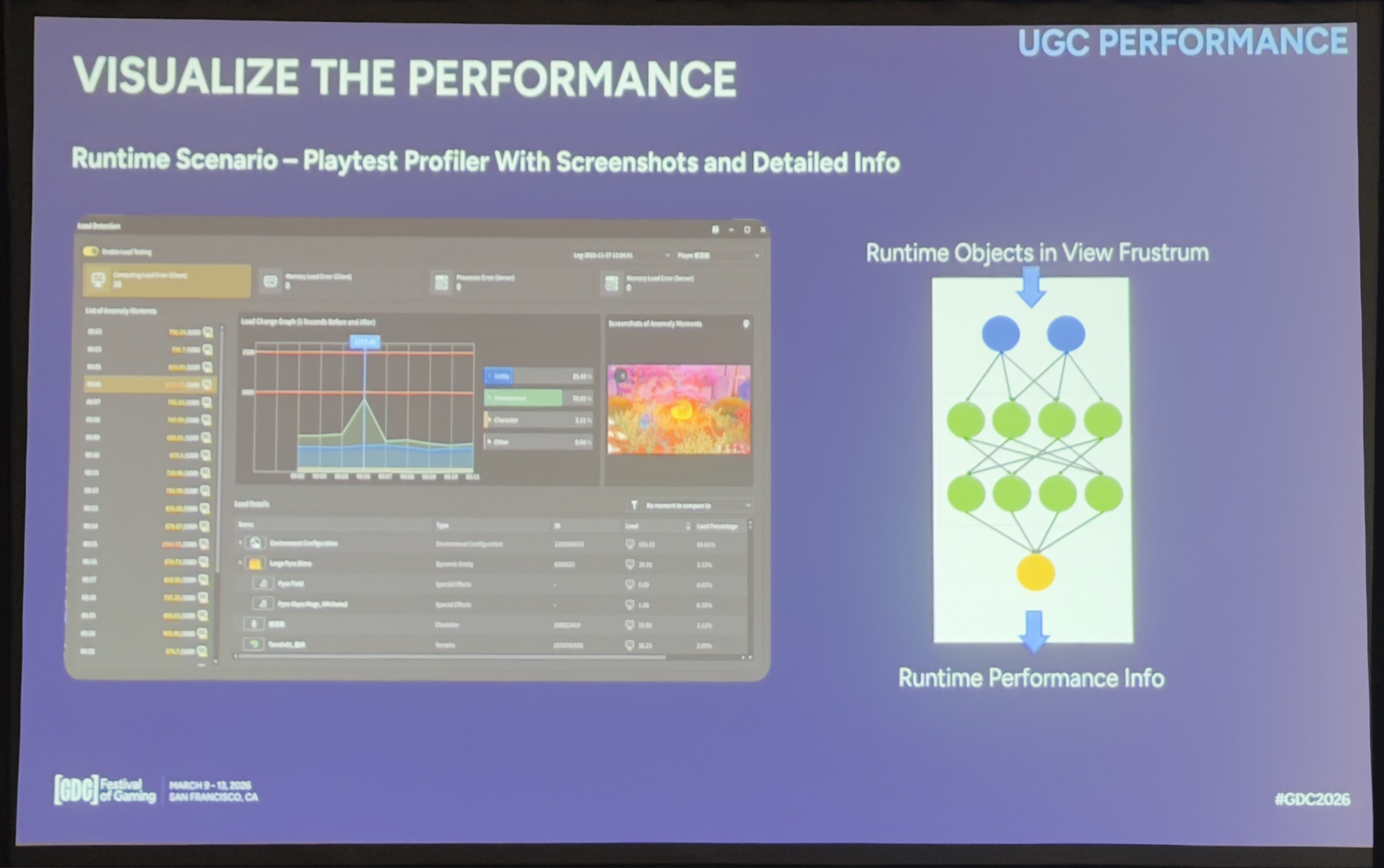 我们还支持试玩过程的运行时剖析。一旦检测到热点,就会抓取屏幕截图,以及当时视锥体内内容的结构化数据——哪些对象、哪些特征,成本集中在哪。这就形成了一个闭环:创作者能把具体的游戏瞬间和底层的性能优化贡献关联起来,从而更有针对性地迭代优化,而不是靠猜。